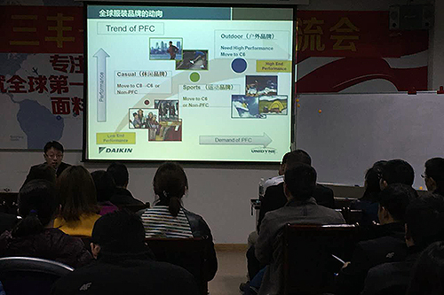 會上,大金防水防油劑營業(yè)部資深主任沈一戍做了全球紡織市場關于PFOA/PFOS法規(guī)及全球服裝品牌動向的報告。接著,大金氟化工防水防油TS部技術科長郭龍做了大金氟化工防水防油劑技術分享。然后,傳化防水劑項目部產(chǎn)品經(jīng)理李海軍提出了印染工廠防水加工常見問題及解決方案。在最后的討論時間,技術人員還針對面料商和品牌商提出的問題做了回答。
