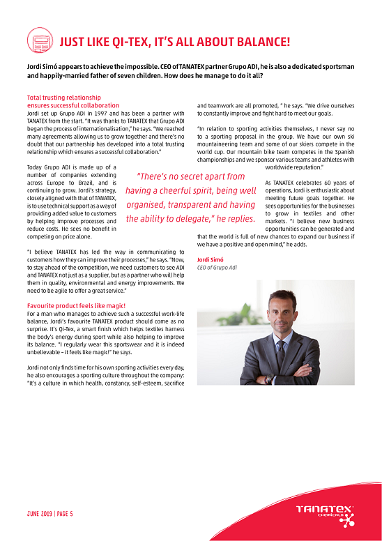 For a man who manages to achieve such a successful work-life balance, Jordi’s favourite TANATEX product should come as no surprise. It’s Qi-Tex, a smart finish which helps textiles harness the body’s energy during sport while also helping to improve its balance. “I regularly wear this sportswear and it is indeed unbelievable – it feels like magic!” he says.