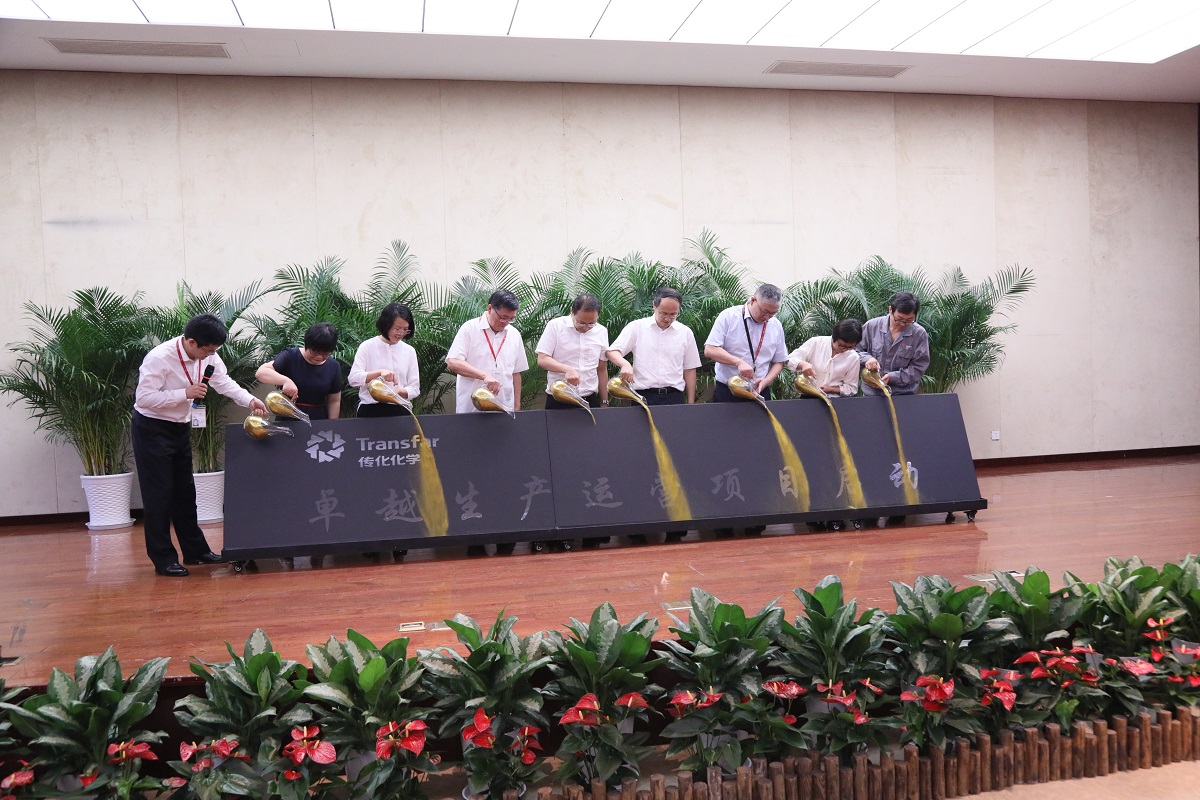 隨后,本次卓越生產(chǎn)運(yùn)營(yíng)項(xiàng)目鎏金啟動(dòng)儀式正式開啟?;瘜W(xué)集團(tuán)董事長(zhǎng)陳捷、總裁周家海、生產(chǎn)中心儲(chǔ)昭華、供應(yīng)鏈中心徐建梅、安全環(huán)保部王厚強(qiáng)、品質(zhì)管理部趙婷、大江東基地於偉剛、生產(chǎn)中心金雅鳳、橋南工廠鄭樂群等人為代表,通過對(duì)啟動(dòng)臺(tái)撒金粉填充,“卓越生產(chǎn)運(yùn)營(yíng)項(xiàng)目啟動(dòng)”幾個(gè)大字緩緩變色,使人眼前一亮,象征著未來卓越起航,再創(chuàng)輝煌!
