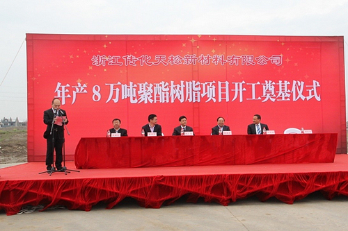 2014年3月28日,浙江傳化天松新材料有限公司年產(chǎn)8萬噸聚酯樹脂項目在浙江省平湖市獨山港鎮(zhèn)舉行了開工奠基儀式。 2012年底,傳化集團與平湖市獨山港區(qū)簽署了項目投資協(xié)議書,根據(jù)協(xié)議約定,公司擬在港區(qū)投資建設年產(chǎn)8萬噸聚酯樹脂生產(chǎn)項目,該項目選址位于獨山港區(qū)白沙路西側、海河路北側,總投資31098萬元,占地80畝,主要建設35800平方米生產(chǎn)車間及配套設置。