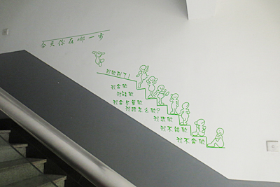 進(jìn)入樓道,首先映入眼簾的就是嫩綠色的勵(lì)志漫畫(huà)。配合樓梯步步上升的趨勢(shì),從“我不能做”到“我想做”,再到“我該怎么做”,最后“我做成了”,漫畫(huà)生動(dòng)體現(xiàn)了做成一件事情的心路歷程?!敖裉炷阍谀囊徊健?,最后一句發(fā)人深思的詢問(wèn),像是鼓勵(lì),又像是溫馨的鞭策。